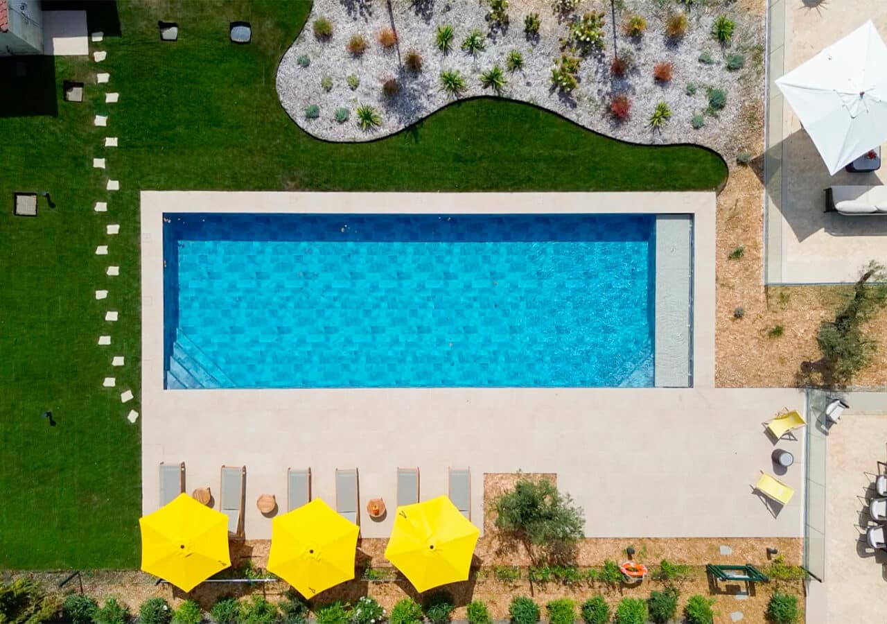 La décoration, pensée comme une maison de campagne chic, mêle matières nobles, tonalités chaleureuses et détails soigneusement sélectionnés. À l’extérieur, la piscine, ouverte sur le paysage, offre un décor privilégié pour profiter du soleil et du calme du domaine.